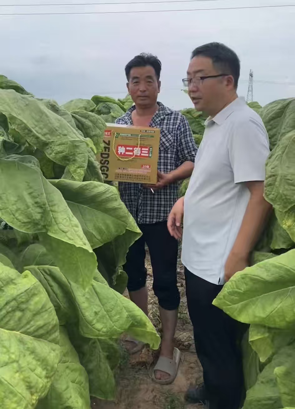 3. 叶面提质高产:在团颗期、旺长期、现蕾期、上部叶成熟初期,分4次喷施“种二得三”专用套餐,精准补充关键营养,保障烟叶品质产量形成。